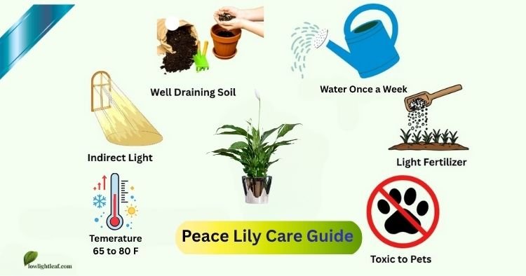 A quick visual guide to peace lily care, including light, watering, soil, temperature, and safety tips.