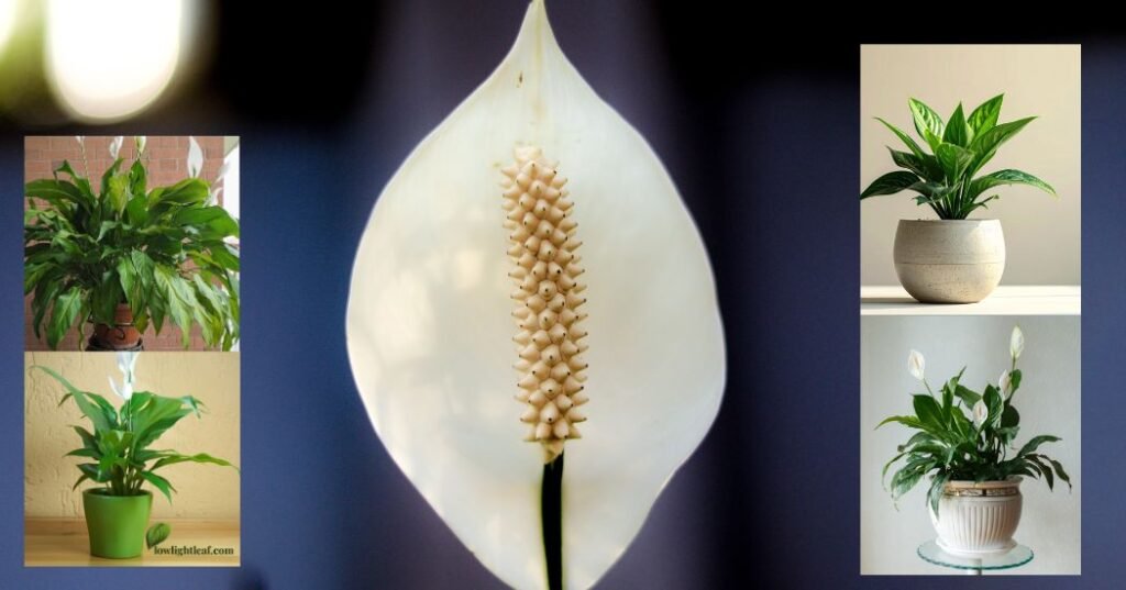 A visual collage showing different peace lily varieties and their iconic white bloom.